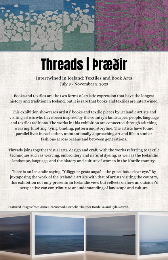 🇮🇸 Sýningin THREADS | ÞRÆÐIR SPOR – Intertwined in Iceland: Textiles and Book Arts opnaði í Nordia House í Portland, Oregon í Bandaríkjunum, þann 8. júlí. Sýningin er á vegum menningarmiðstöðvarinnar Nordic Northwest og stendur til 5. nóvember 2023. Átta ARKIR sýna þar ásamt fjórum erlendum listakonum sem allar hafa starfað að list sinni í vinnustofum á Íslandi í lengri eða skemmri tíma.